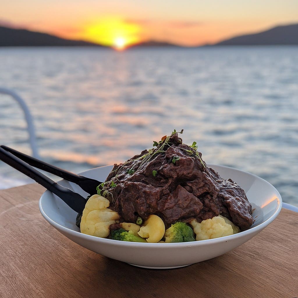 Instructions: Thaw bag before use if frozen. Heat in pot of barely simmering water for 15 minutes. Heat potato and veg same way or microwave if your vessel has this option. Put potato on plate, pour contents of bag over potato with side of vegetables.