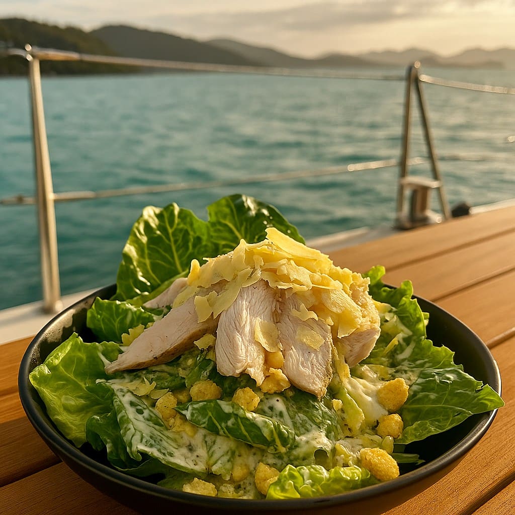 Ingredients : Coz Lettuce, Bacon, Egg, Parmesan Cheese, Bread Croutons, & Caesar salad Dressing (includes anchovies, oil, garlic, Worstershire sauce, parmesan cheese.)